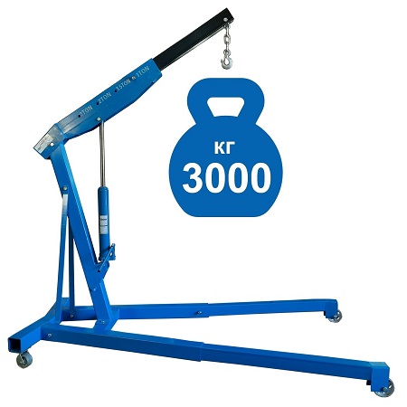 Для профессионального применения. Грузоподъемность 3т. Не складной. Высота подъема 330-2450 мм. Предназначен для подъема и транспортировки автомобильных узлов, агрегатов и любых других грузов как внутри помещения так и на улице. Вынос стрелы регулируется в соответствии с максимальной грузоподъемностью крана – 1000-3000кг. Рабочим приводом крана является гидроцилиндр.