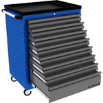 Верстак бестумбовый поставляется в разобранном виде (4 места). Нагрузка на столешницу до 600 кг. Стандартный цвет: корпус - серый глянец RAL 7030, ящики и двери тумб - синий RAL 5017. Размеры: 855х1000х420мм. Вес: 24 кг.