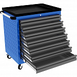 7 ящиков. Оборудована большой прочной пластиковой ручкой. Перфорированные боковые стенки с квадратными отверстиями предоставляют возможность разместить дополнительные аксессуары для хранения инструментов. Роликовые направляющие с функцией автоматического возврата обеспечивают плавность открывания/закрывания секций. Колеса из термопластичного каучука, обеспечивают легкое и бесшумное перемещение тележки. Наличие центрального замка