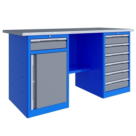 Верстак однотумбовый поставляется в разобранном виде. Нагрузка на столешницу до 600 кг. Стандартный цвет: корпус - серый глянец RAL 7030, ящики и двери тумб - синий RAL 5017. Размеры:855x1400x700 мм. Вес: 62 кг.