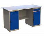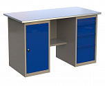Стол бестумбовый поставляется в разобранном виде (4 места). Нагрузка на столешницу до 600 кг. Стандартный цвет: корпус - серый глянец RAL 7030, ящики и двери тумб - синий RAL 5017. Размеры: 855х1200х700мм. Вес: 40 кг.