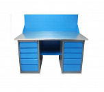 Верстак двухтумбовый поставляется в разобранном виде (4 элемента). Нагрузка на столешницу до 600 кг. Стандартный цвет: корпус - серый глянец RAL 7030, ящики и двери тумб - синий RAL 5017. Размеры:855x1400x700 мм. Масса: 111 кг.
