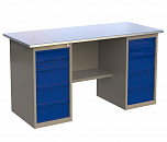 Верстак двухтумбовый поставляется в разобранном виде (4 элемента). Нагрузка на столешницу до 600 кг. Стандартный цвет: корпус - серый глянец RAL 7030, ящики и двери тумб - синий RAL 5017.  Размеры: 855x1400x700 мм. Масса: 78 кг.