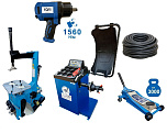 Комплект: шиномонтажный станок TS-21 для дисков: внешний 11÷20” + пистолет с манометром для подкачки шин + монтажка + пластиковые накладки на зажимные кулачки + регулятор давления с влагоотделителем и манометром. + TS-500 балансировочный станок с автозапуском, для колес легковых автомобилей и легких грузовиков, диаметр диска с резиной до 760 мм. размеры диска: ширина 3"–9” (76-228 мм), диаметр диска  10"–21” (254-533 мм). + кожух защитный + клещи + кронциркуль + быстрозажимная гайка + набор конусов + подкатной домкрат г/п 3,0т. 130-465мм. + ударный пневмогайковерт 1/2" крутящий момент 745Нм +  шланг кислородный 9мм 20Атм. 10м