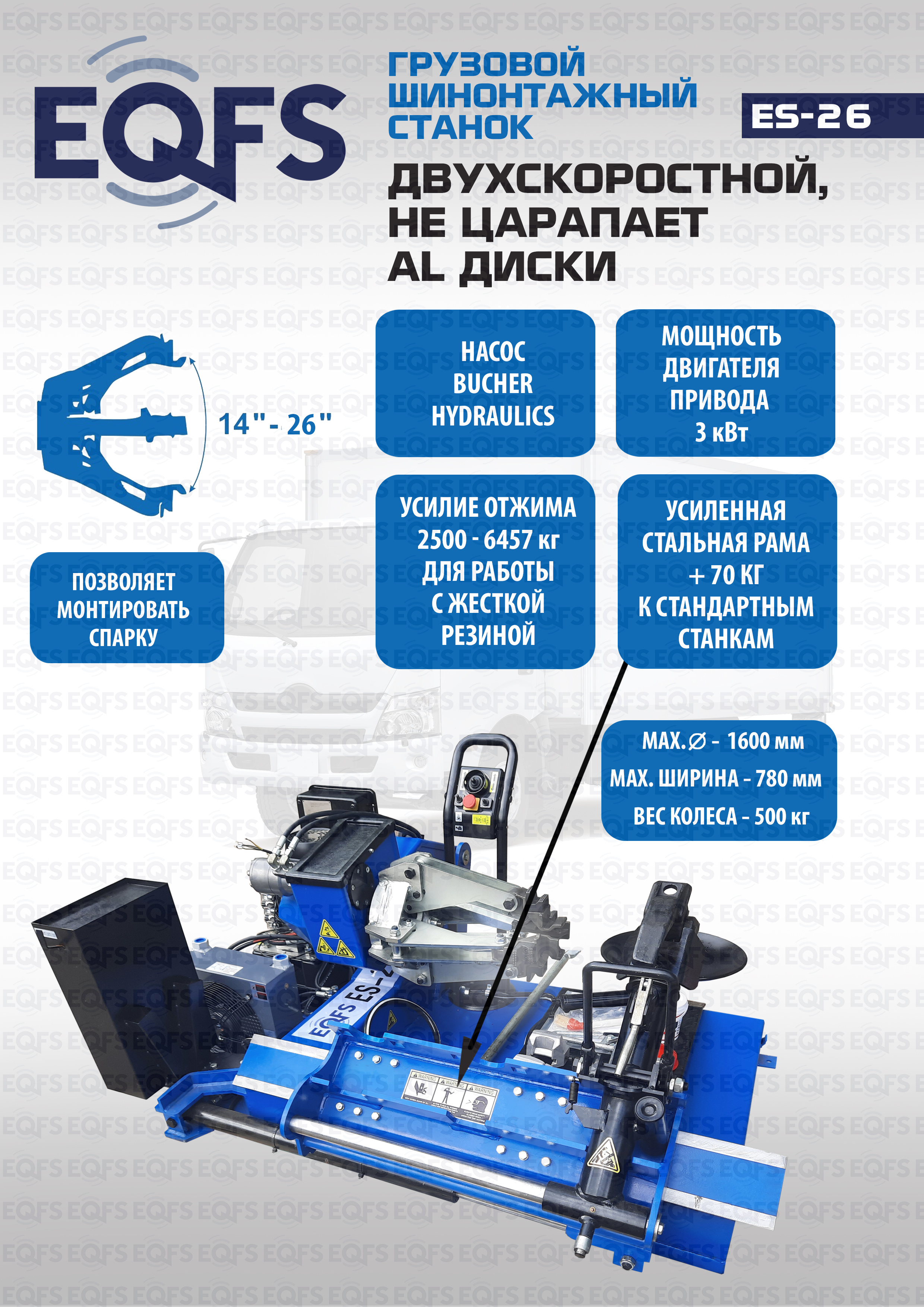 1. ES-26: гидравлический привод зажима колеса, усиленная рама, 2-х скоростной, дополнительные адаптеры для работы с алюминиевыми дисками.
