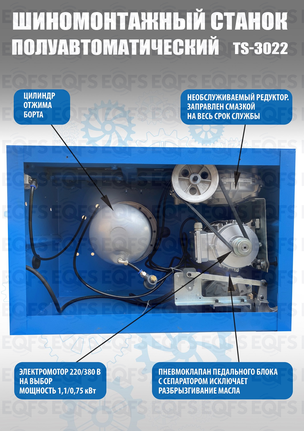 Полуавтоматического шиномонтажного станка TS-3022 предназначен для монтажа и демонтажа колес легковых автомобилей, легких грузовиков, не больших автобусов и коммерческой техники. Внешний зажим 11-21”. Внутренний зажим 12-24”. В комплекте: пистолет для подкачки шин + монтажка + регулятор давления с влагоотделителем и манометром. Рекомендуется для постов со средней и высокой проходимостью. Напряжение шиномонтажных станков 220В или 380В на выбор.