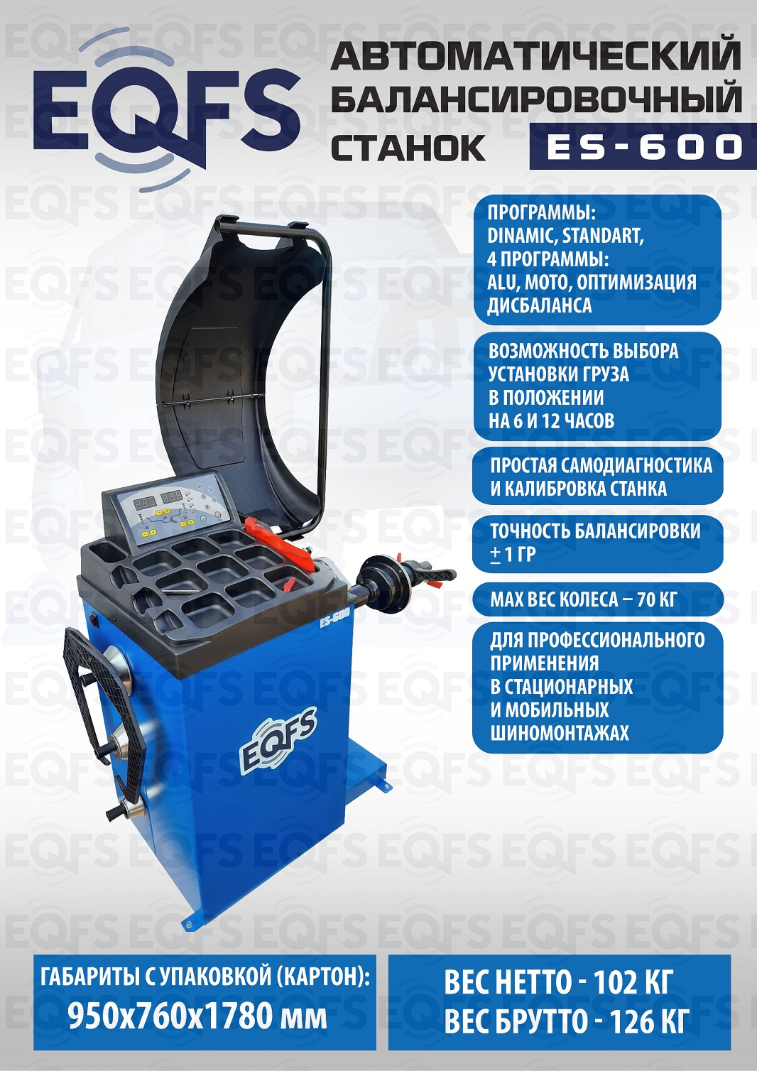 + ES-600 автоматический балансировочный станок. Удобный и понятный интерфейс. Лазерная указка места крепления груза. Режим автокалибровки. Режим самодиагностики. Для балансировки колёс легковых автомобилей, мотоциклов и лёгких грузовиков с диаметром диска с резиной до 800 мм. Размеры диска: ширина 3–10” (76-254 мм) , диаметр диска 10–24” (254÷609 мм). Прочный вал  Ø - 40мм. Гарантия 18 мес – наш монтаж, 12 мес – самостоятельная установка. В комплекте: кожух с автозапуском + клещи + кронциркуль + быстрозажимная гайка + набор конусов.