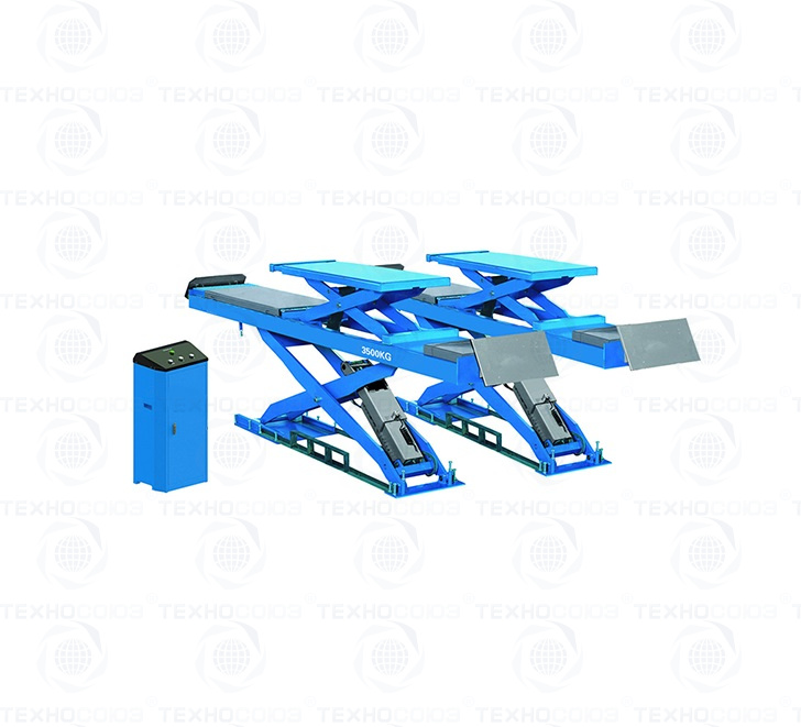 Двухуровневый ножничный подъемник оборудован пневматическим стопорным механизмом – требуется подключение к пневмолинии. Стойка управления подъемником расположена отдельно.