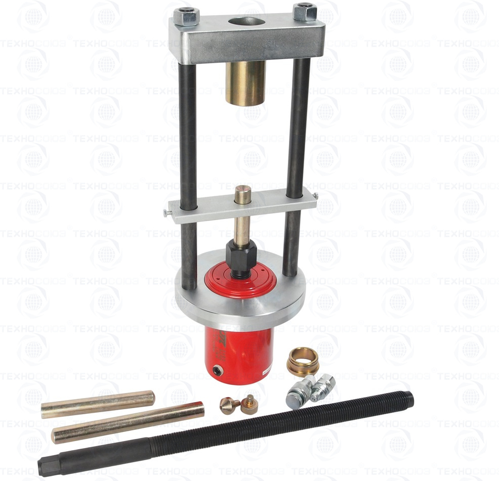 • В комплекте: съемник, гидравлический цилиндр, три 22-миллиметровых насадки (4", 6" и 8"), две 1 3/8" направляющие (7/8" и 3 1/4").