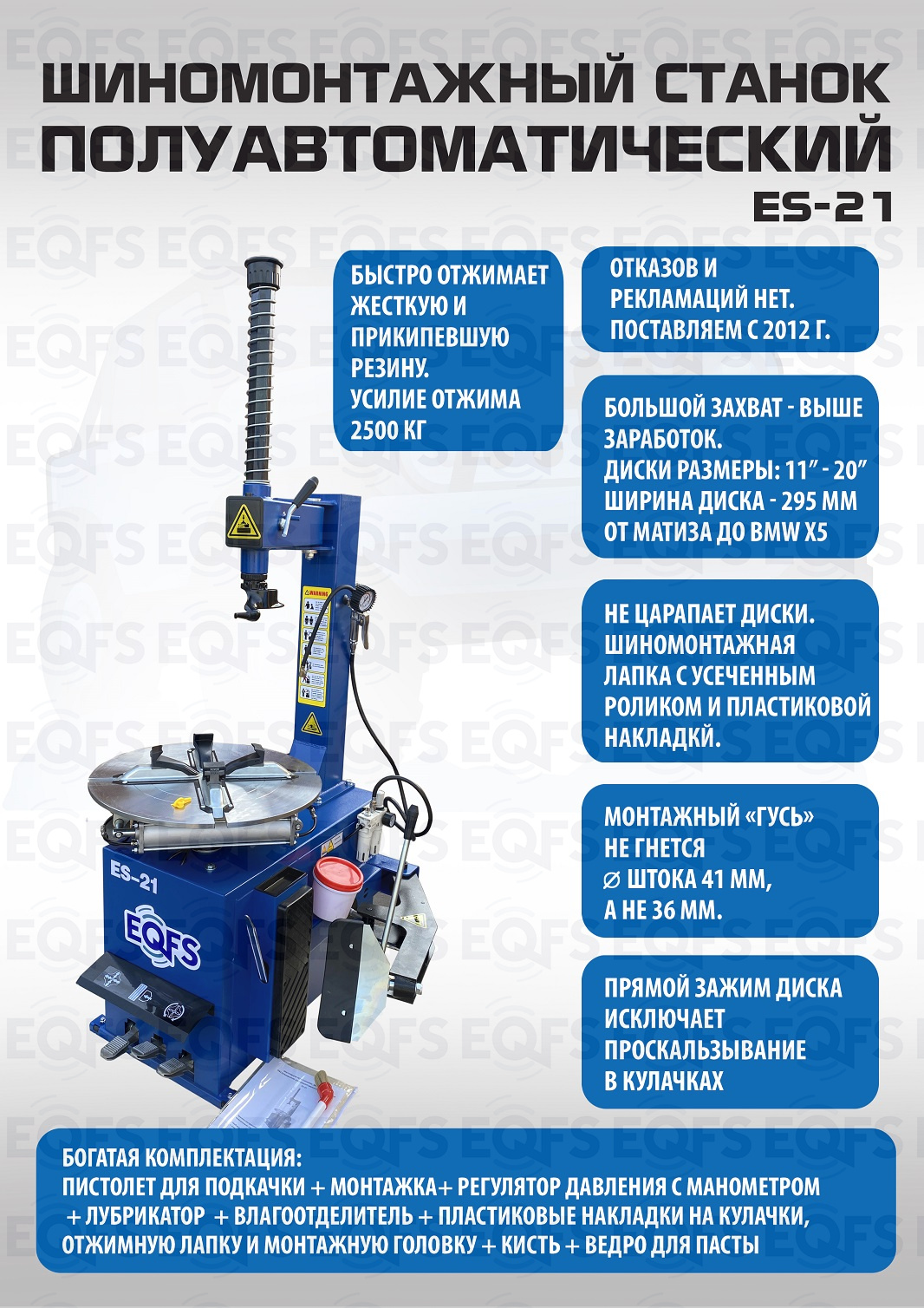 Полуавтоматический шиномонтажный станок  внешний 11÷18”, внутренний 12÷20”. Большой круглый стол Ø 560мм. Усилие отжима увеличено до 2700кгВ комплекте: пистолет для подкачки шин + монтажка + пластиковые накладки на зажимные кулачки + регулятор давления с влагоотделителем и манометром. Может комплектоваться «третьей рукой» для работы с низким профилем (опция). Очень надёжный шиномонтажный станок, рекомендуем.