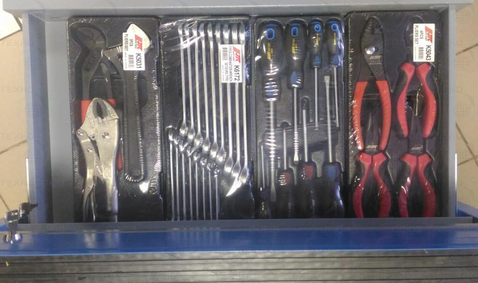 Данный набор инструмента включает: тележку инструментальную с 4 ящиками, комбинированные ключи, наборы головок и отверток, клещи, утконосы, щипцы и трещотку - это тот самый минимум, который понадобится при работе в гараже или СТО.
