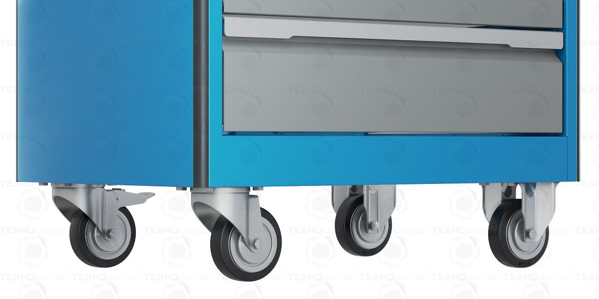 Тележка оснащена четырьмя колесными опорами с диаметром колеса 100 мм. Две поворотные колесные опоры с тормозом и две поворотные колесные опоры без тормоза.