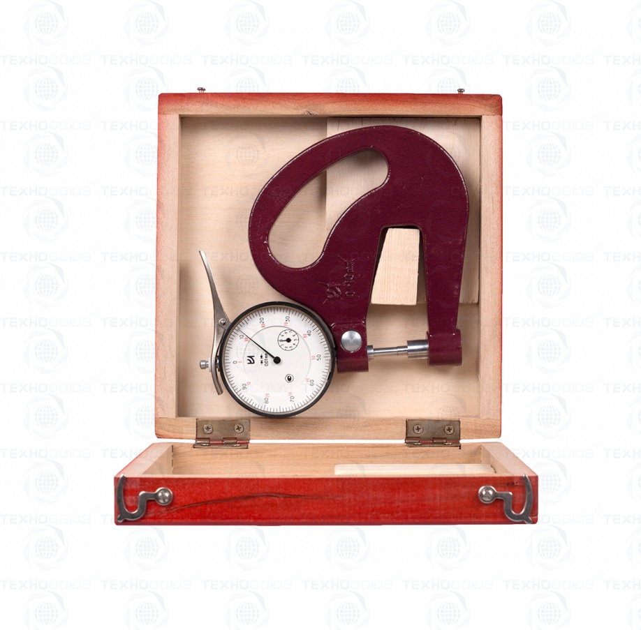 Толщиномер представляет собой скобу, в которой сверху расположено отсчетное устройство с измерительным наконечником , а снизу запрессована пятка. У толщиномера с нормированным измерительным усилием для установки измерительного стержня отсчетного устройства в рабочее положение имеется арретир (отводка).